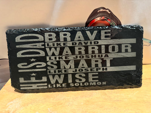 ENGRAVED HE IS DAD, a natural rock slate. Optional personalization is available.