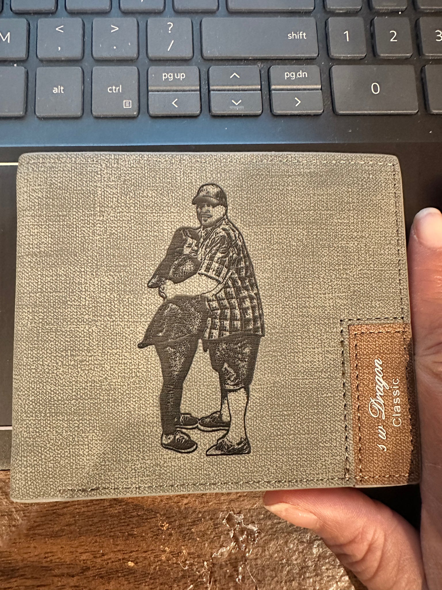 Personalized photo engraved wallet for men. Material: PU leather, no buttons or zipper, simple design.